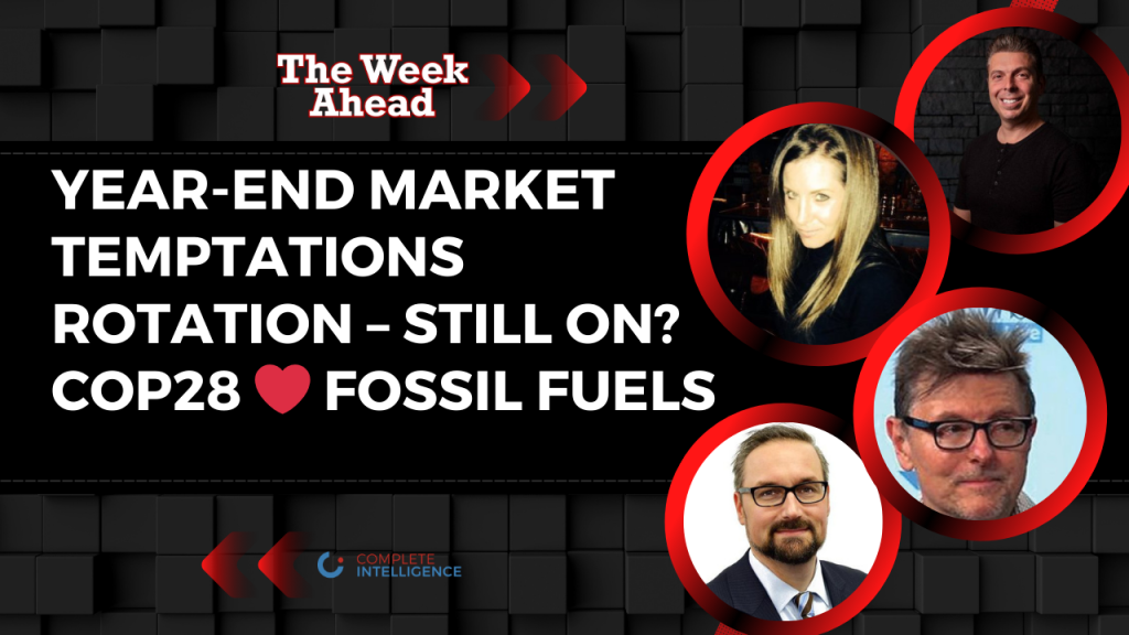 This Week Ahead episode is joined by Anthony Crudele, Michael Belkin and Tracy Shuchart. They discuss Year-end market temptations, Rotation – still on? and COP28 ❤️ fossil fuels.